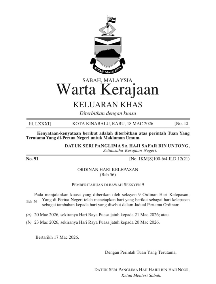 KOTA KINABALU: Kerajaan Negeri turut mengumumkan tarikh 20 Mac 2026 atau 23 Mac 2026 sebagai cuti umum tambahan, bergantung kepada tarikh Hari Raya Aidilfitri tahun ini, seiring dengan pengumuman Perdana Menteri.