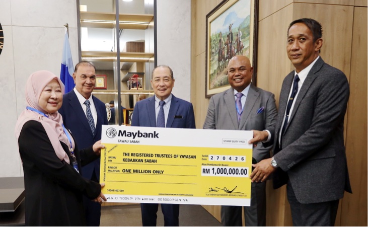 KOTA KINABALU: Ketua Menteri, Datuk Seri Panglima Haji Hajiji Haji Noor menyaksikan penyerahan replika cek sebanyak RM1 juta daripada Pengerusi Sabah Softwoods Berhad, Datuk Arsad Bistari kepada Pengarah Yayasan Kebajikan Sabah (YKS), Datuk Diyanah Abdullah di Pejabat Ketua Menteri, Bangunan DUN Sabah, di sini pada Isnin.