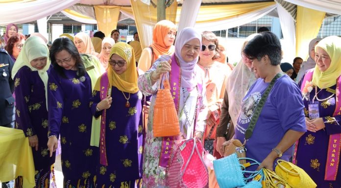 Isteri Ketua Menteri, Datin Seri Panglima Datuk Hajah Juliah Salag yang juga Penaung Persatuan Suri dan Anggota Perkhidmatan Awam Malaysia (PUSPANITA) Cawangan Sabah mengambil peluang melawat gerai pameran yang menyajikan pelbagai produk termasuk kraftangan dan makanan tradisi, selepas merasmikan Walai Alap PUSPANITA Cawangan Daerah Tuaran, di Tuaran, pada Khamis. -pr/BNN