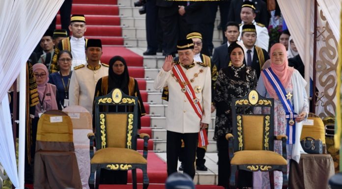 KOTA KINABALU: Ketua Menteri, Datuk Seri Panglima Haji Hajiji Haji Noor dan isteri, Datin Seri Panglima Datuk Hajah Juliah Salag menghadiri Istiadat Pembukaan Penggal Kelima