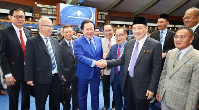 Ketua Menteri, Datuk Seri Panglima Haji Hajiji Haji Noor bersalam dengan Datuk Bobbey A.Suan yang dipilih semula sebagai Ahli Dewan Negara (Senator) bagi penggal ke 2 pada hari akhir Mesyuarat Ketiga Penggal Keempat Dewan Undangan Negeri (DUN) Sabah ke 16 di Bangunan DUN Sabah, Kota Kinabalu pada Khamis.-pr/BNN