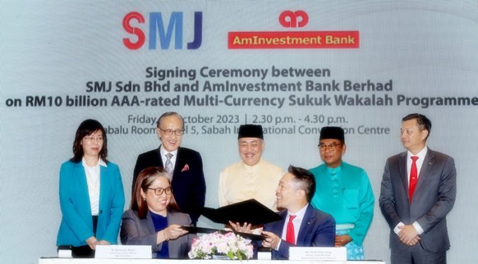KOTA KINABALU: Chief Minister Datuk Seri Panglima Haji Hajiji Haji Noor witnessed the signing ceremony between Sabah state’s oil and gas company SMJ Sdn Bhd (SMJSB) and AmInvestment Bank Berhad (AIBB) to mark the inaugural issuance of RM900 million Sukuk Wakalah under its RM10 billion AAA-Rated Multi-Currency Islamic Medium-Term Notes programme.