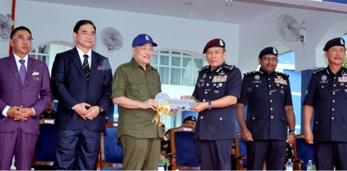 Chief Minister Datuk Seri Panglima Haji Hajiji Haji Noor presented the key replica to Inspector-General Police Dato Sri Mohd Khalid Ismail as the handing over gimmick in a ceremony at the Sabah Police Contingent Headquarters Drill Field in Kepayan...