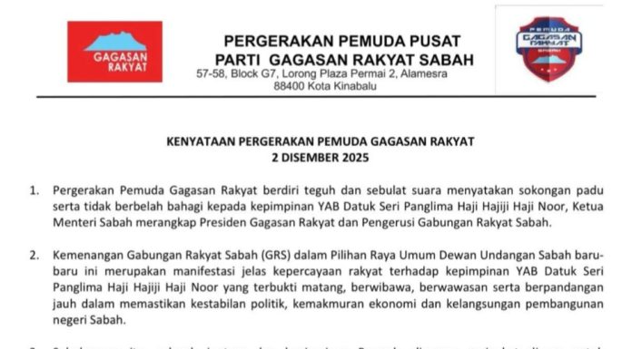 KOTA KINABALU: Pergerakan Pemuda Parti Gagasan Rakyat Sabah (Gagasan Rakyat) menegaskan komitmen dan sokongan tidak berbelah bahagi kepada kepimpinan Ketua Menteri, Datuk Seri Panglima Haji Hajiji Haji Noor, sambil menyifatkan kemenangan Gabungan Rakyat Sabah (GRS) dalam Pilihan Raya Umum Dewan Undangan Sabah baru-baru ini sebagai bukti jelas kepercayaan rakyat terhadap pentadbiran beliau.