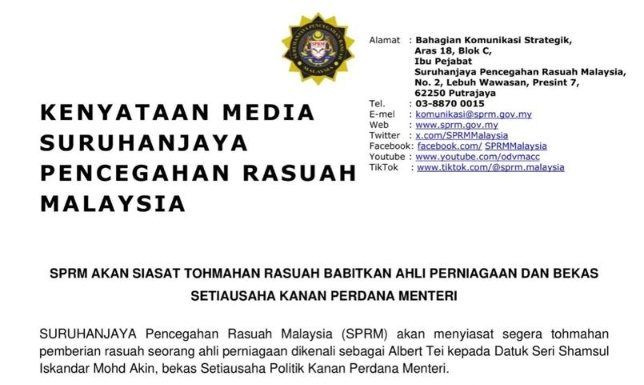 PUTRAJAYA: Suruhanjaya Pencegahan Rasuah Malaysia (SPRM) akan menjalankan siasatan segera berhubung dakwaan rasuah yang mengaitkan seorang ahli perniagaan, Albert Tei, dengan Datuk Seri Shamsul Iskandar Mohd Akin, bekas Setiausaha Politik Kanan Perdana Menteri.