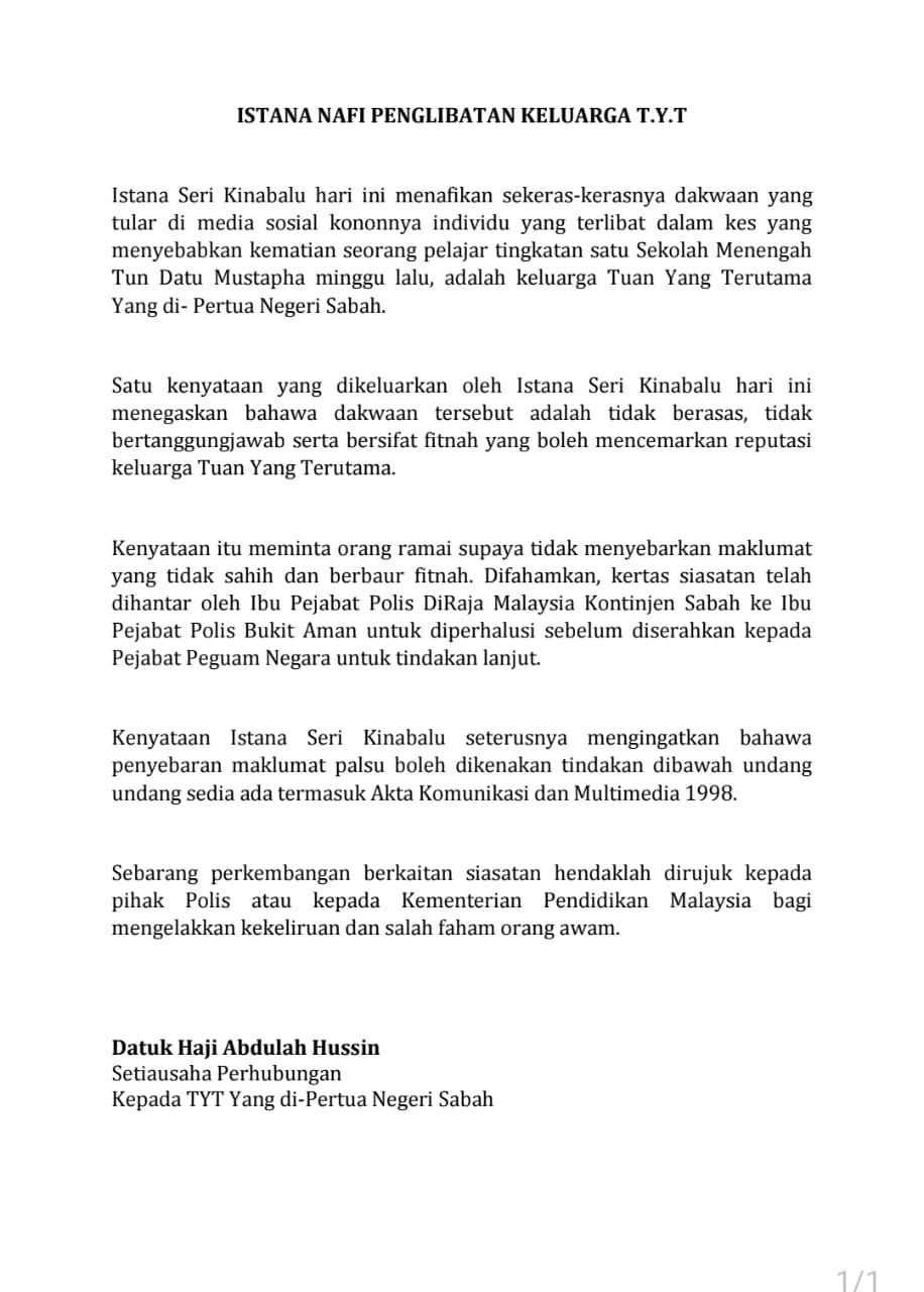 KOTA KINABALU: Istana Seri Kinabalu hari ini menafikan sekeras-kerasnya dakwaan tular di media sosial yang mengaitkan keluarga Tuan Yang Terutama (TYT) Yang di-Pertua Negeri Sabah dengan insiden kematian seorang pelajar tingkatan satu Sekolah Menengah Tun Datu Mustapha, minggu lalu.
