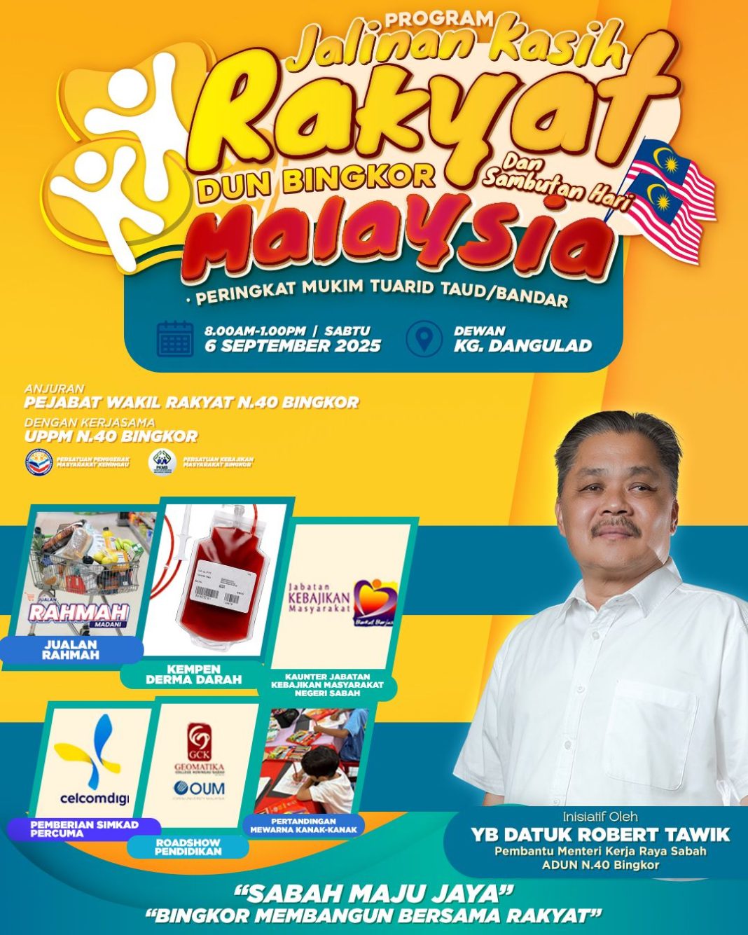 KENINGAU: Program Jalinan Kasih Rakyat DUN Bingkor yang digabungkan dengan sambutan Hari Malaysia bakal berlangsung Sabtu ini, 6 September, bermula jam 8 pagi hingga 1 tengah hari di Dewan Kampung Dangulad, Bingkor.
